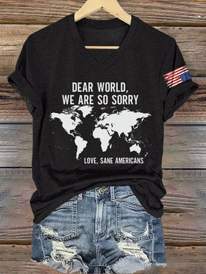 V-Neck Retro Dear World We Are So Sorry, Love, Sane Americans Print T-Shirt
