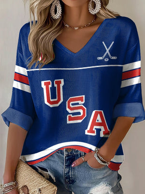 V-Neck Retro USA Ice Hockey Print T-Shirt